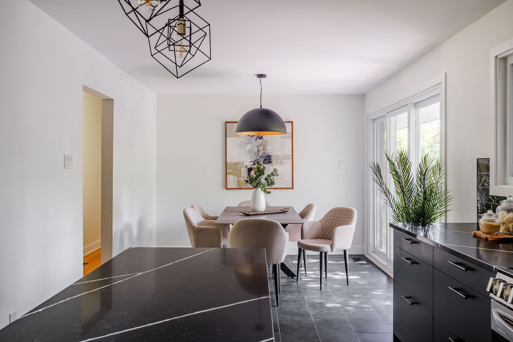 This 1969 mid-century bungalow hadn't been refreshed since the 1970s. As part of the larger renovation scope, the goal was to transform the space while honouring its original character - covering decades of dark yellows and browns with a clean, pure white finish. The project required extensive surface preparation and multiple coats to achieve the flawless result the homeowners envisioned. We also refinished and stained the existing wood elements to complement the newly renovated walnut kitchen and bathroom cabinets. In addition to the interior work, the exterior white wood siding, doors, and windows were painted black to modernize the house and contrast with the existing red brick.